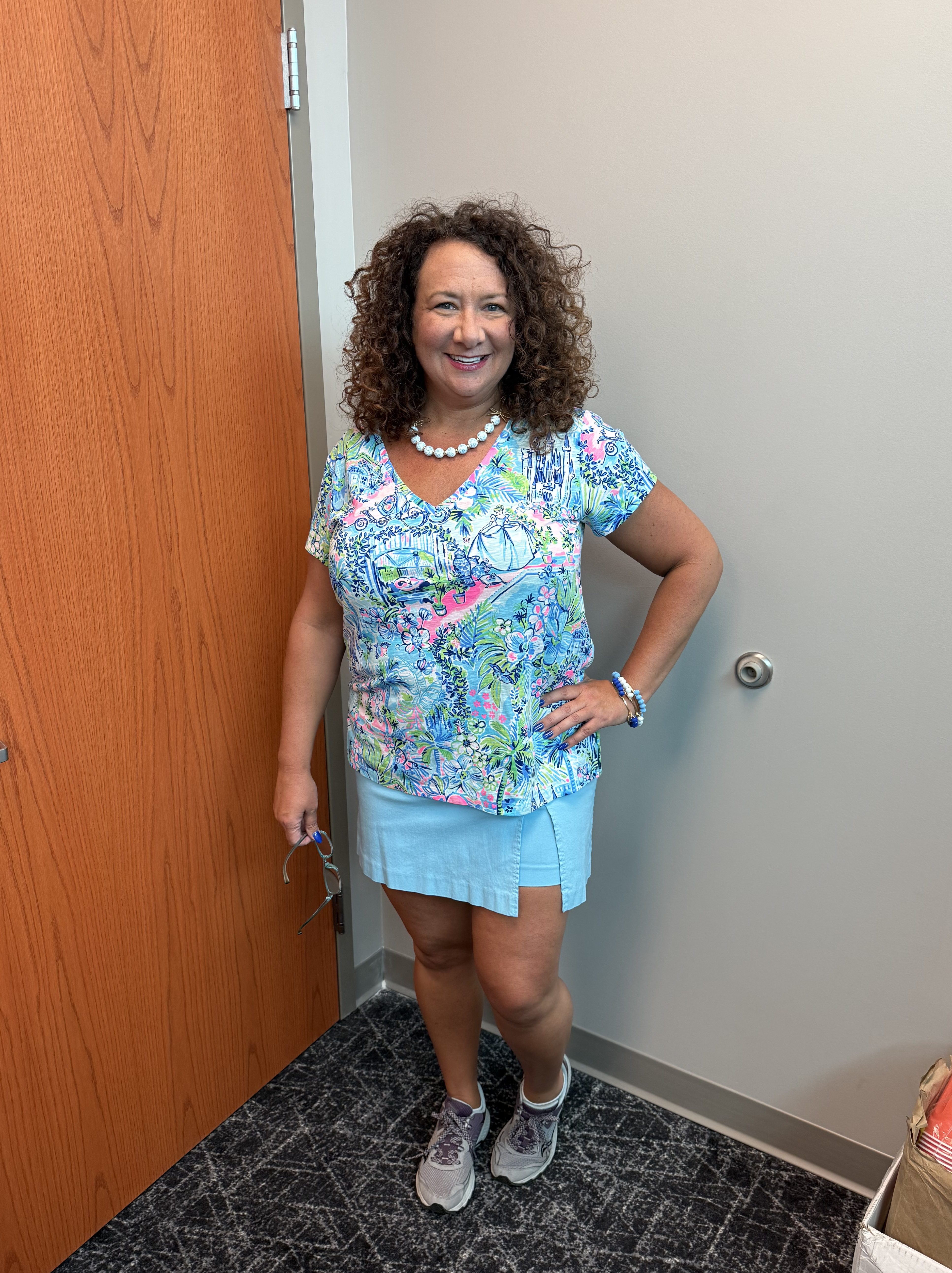 Dressing for our show in Sharonville, Ohio, in August. This was for our Preview Night on Friday evening. Our theme was “Once Upon a Stampaway”. I don’t do costumes…just not something I like to spend money on, personally. This was the closest I could get to “dressing up” using items I know that I will wear again. Sporting my Cinderella shirt by Lily Pulitzer, with a Canvas Style necklace, and some Millie bangle bracelets from Bourbon and Boweties. I call this look “Athletic Cinderella”. :p