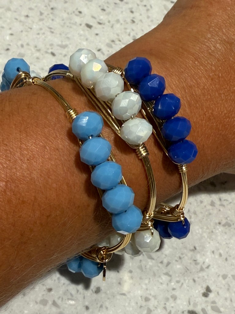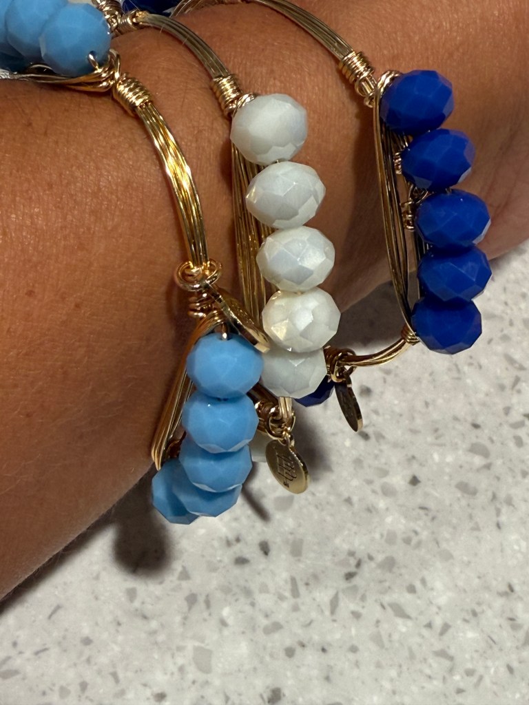 This stack of three Millie bangles from Bourbon and Boweties make a bold, yet subtle statement! Super excited that the top one perfectly matches my nail color! Millie bangles from B&B are five beads, on three sides of the bangle. They come in a huge variety of colors and variations. These are one of my fave bangles, as they can easily be worn separately or together in a fun stack!