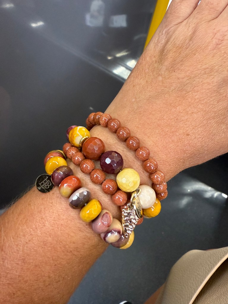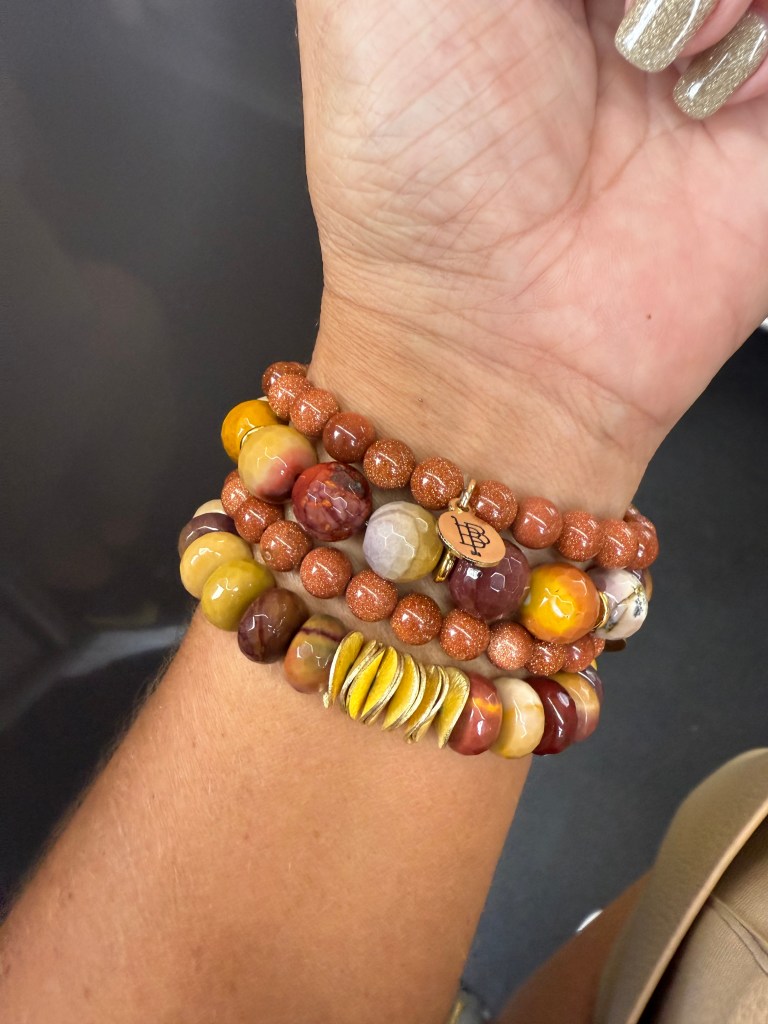 Check out this bracelet stack featuring Kendleys and stacker stretchies in gorgeous fall colors from Bourbon and Boweties. Kendley bracelets from B&B are always a beaded stretch bracelet, featuring beads in varying shapes and colors. Stacker stretch beaded bracelets contain smaller beads than the Kendleys, and are meant to “stack” to enhance the combination.