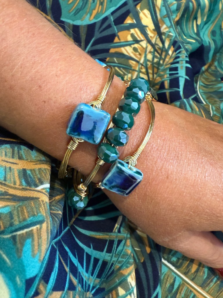 This small bangle stack of blue and green perfectly matched my tropical patterned dress. The pieces on the outer bangles are similar to small ceramic tiles, with a shiny finish. The middle bangle is known as a Millie from Bourbon and Boweties. The Millie bangles have three groups of five beads. They come in a variety of colors and bead shapes, however, the beads are always similar in size, even if they have slightly differing shapes.