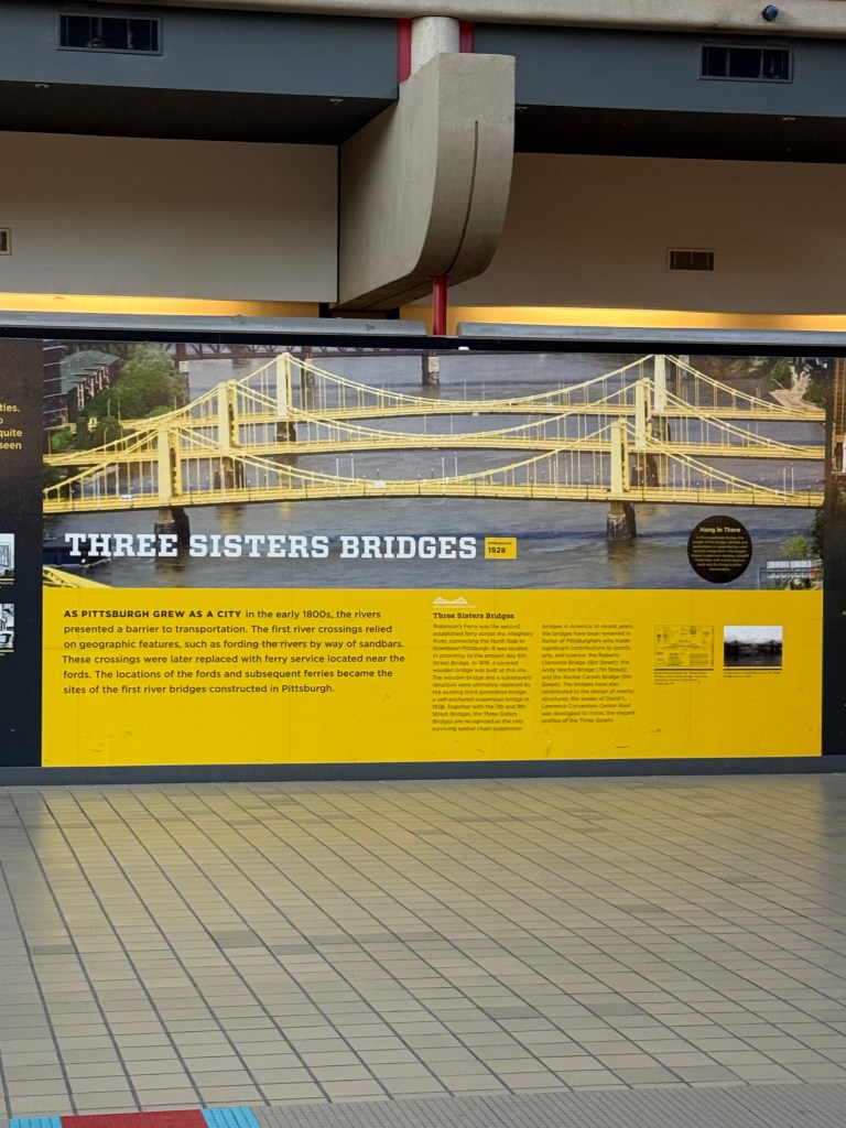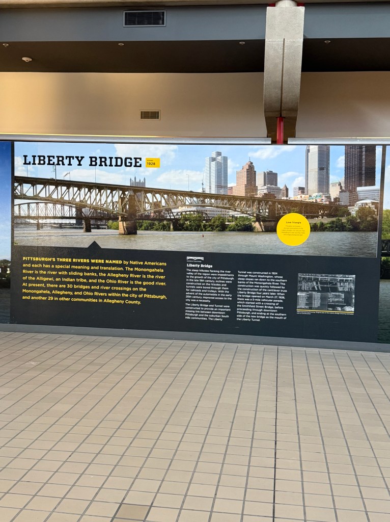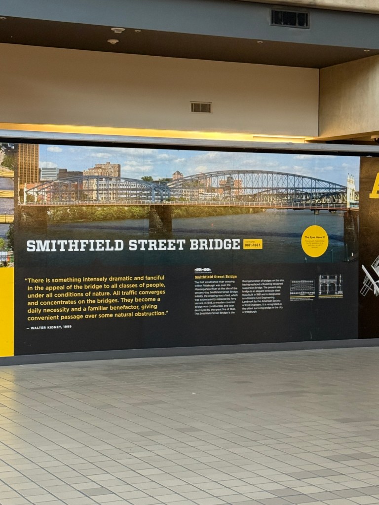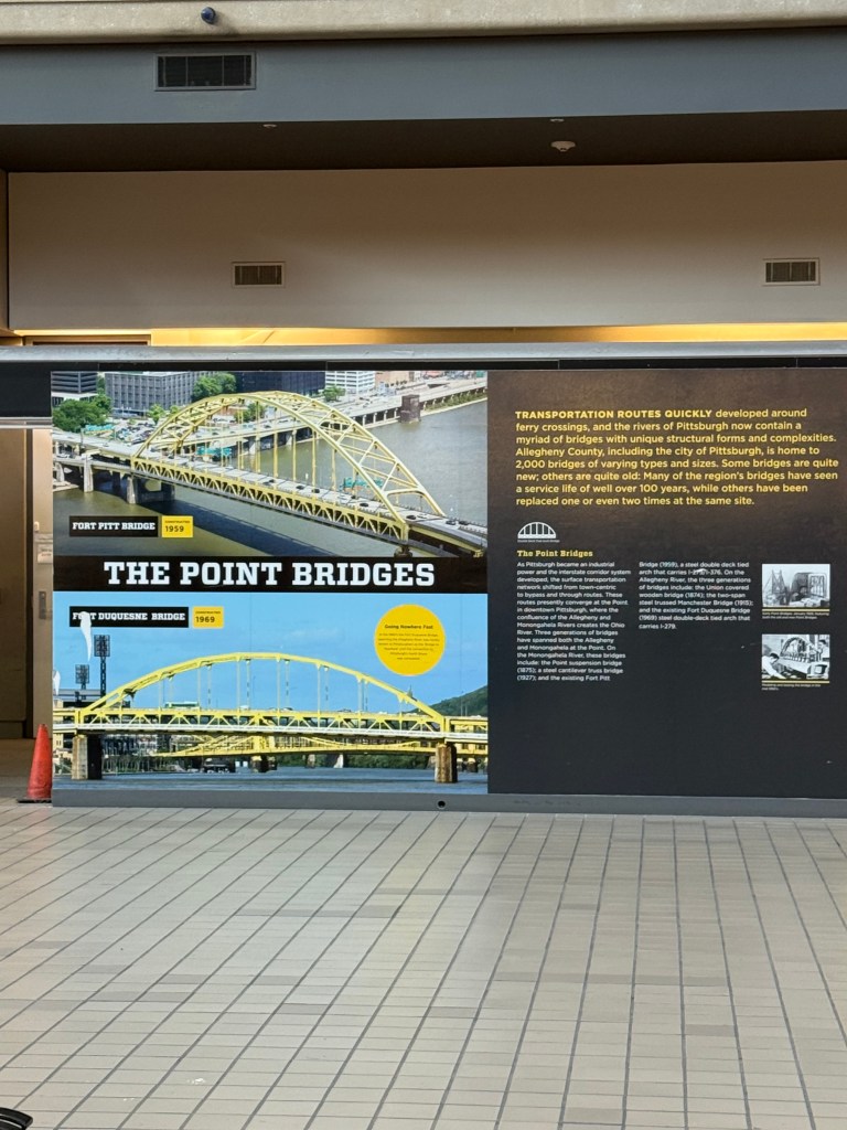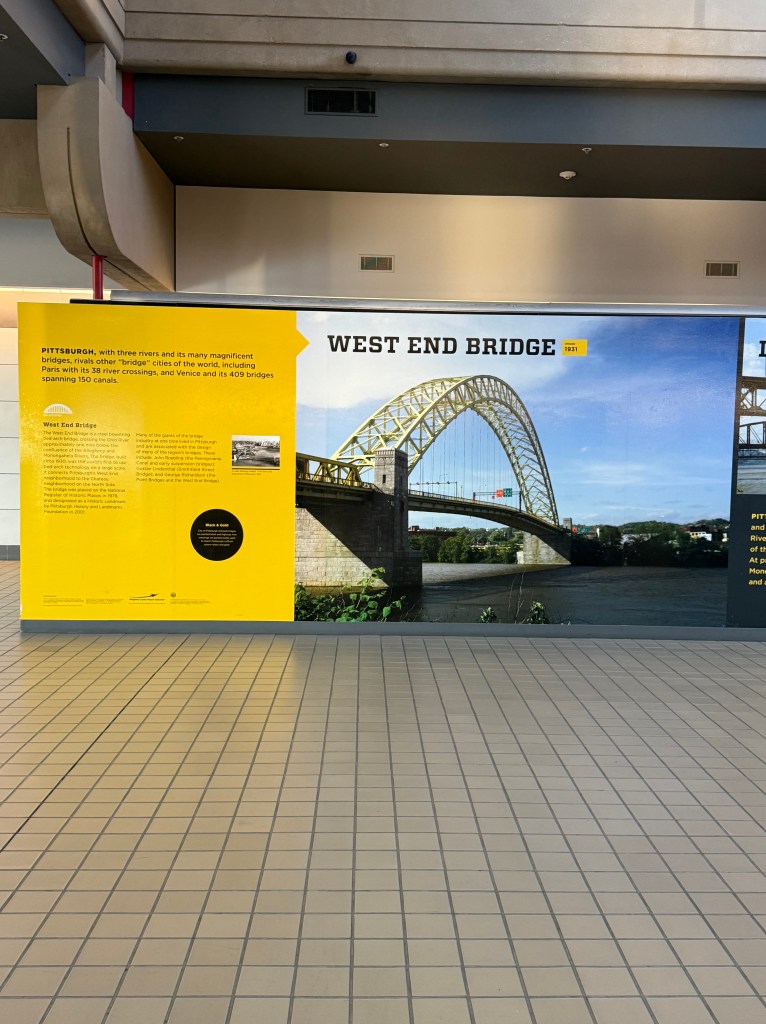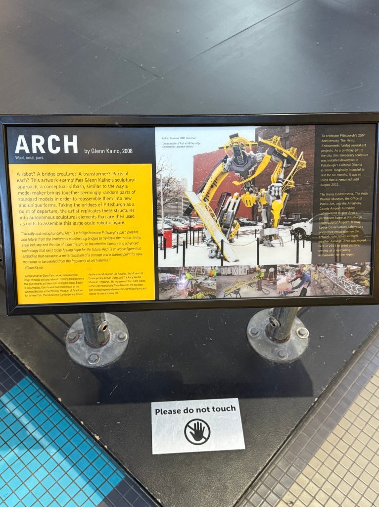 Known as “Arch”, this transformer looking piece of artwork was created by Glenn Kaino in 2008, and was located in downtown Pittsburgh, until it was restored and moved to Pittsburgh International Airport in 2013. It was created to celebrate Pittsburgh’s 250th anniversary, and honors the many bridges that run throughout the city. The placards next to the sculpture speak of the Pittsburgh bridges, so that viewers can try and identify the various bridges that make “Arch”.
