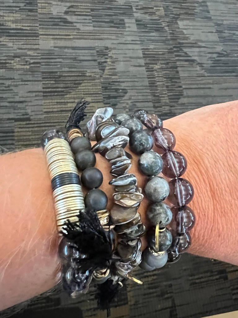 This combination was a travel day stack, featuring pieces from a two different companies, Allie + Bess and Kingsley Armelle. The bracelets on either end are from Allie + Bess, and the three in between are from Kingsley Armelle. I love pairing the natural stone beaded with the clear, black beads. I also really like the black tassel accent on the solid black beaded bracelet.