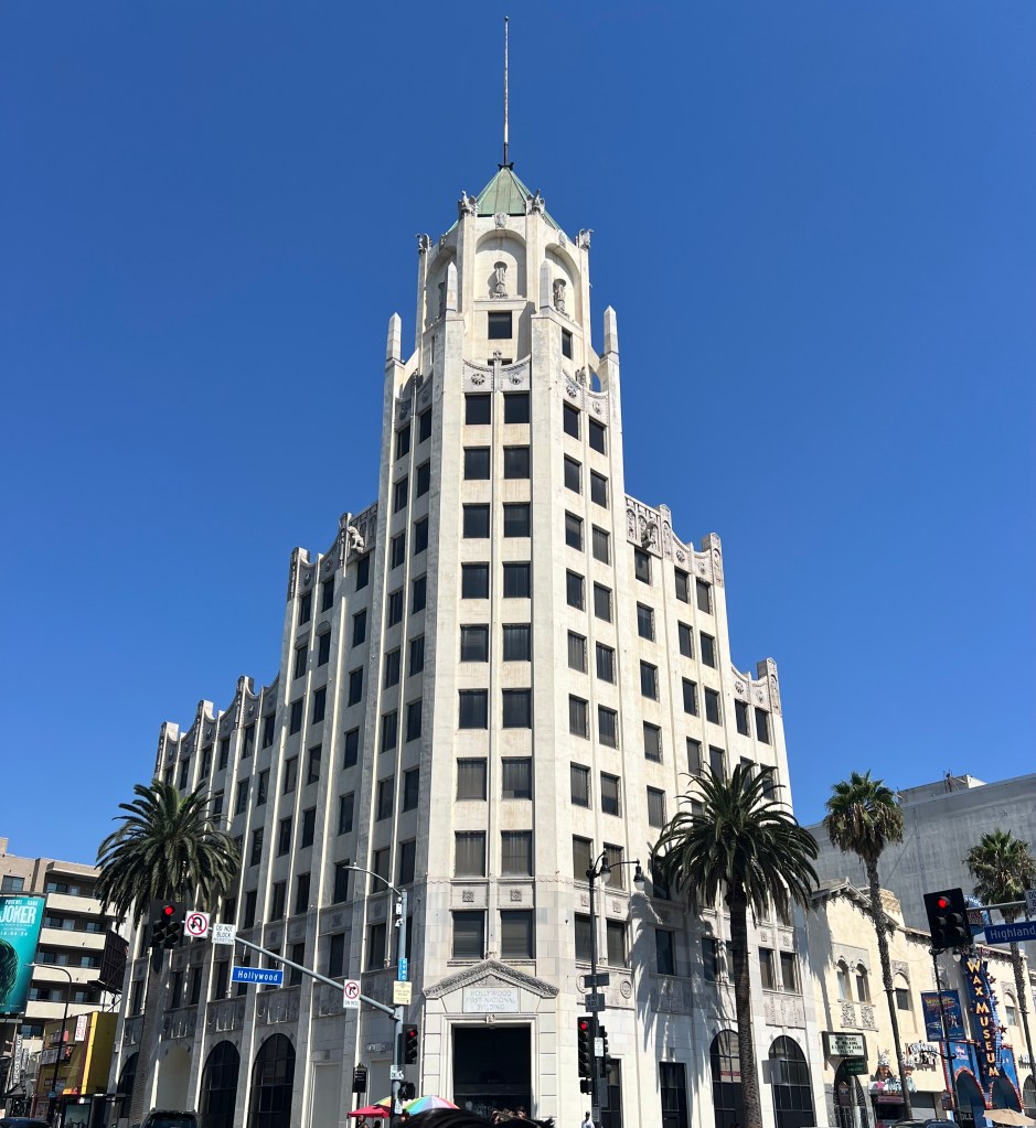 Hollywood’s First National Bank Building, is a historic thirteen-story building at the corner of Hollywood Blvd. and Highland Avenue, in. Hollywood, California. At 13 stories and 183 feet in height, the building features art deco and neo-Gothic styles, that fit perfect into the fantasy that is Hollywood. The bas-relief panels on the building show Nicholas Copernicus and Christopher Columbus, for a nod to discovery and enterprise. The building’s facade is adorned with medieval figures, floral patterns, and ,medallions.