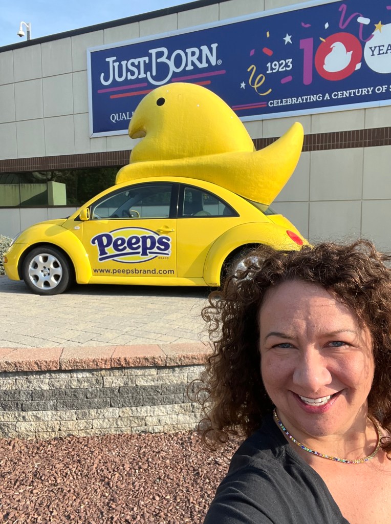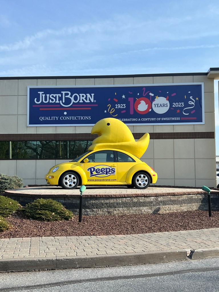 Just Born, located in Bethlehem, PA, manufactures and distributes various confectionary wonders, such as Hot Tamales, Mike and Ike, but most importantly, Peeps! While in Allentown, PA, for a show, I decided to take a trip by their factory. While the factory does not offer tours, it was still fun to see the outside of the building and the Peeps mobile. Founded in 1923, the company relocated to Bethlehem, PA, in 1932. In 1953, Just Born acquired the Rodda Candy Company, which was a manufacturer of jelly beans and the seasonal Easter candy known as Peeps. Thus, Peeps were then Just Born. 🙂