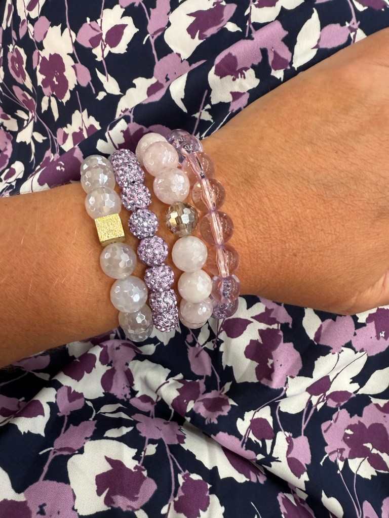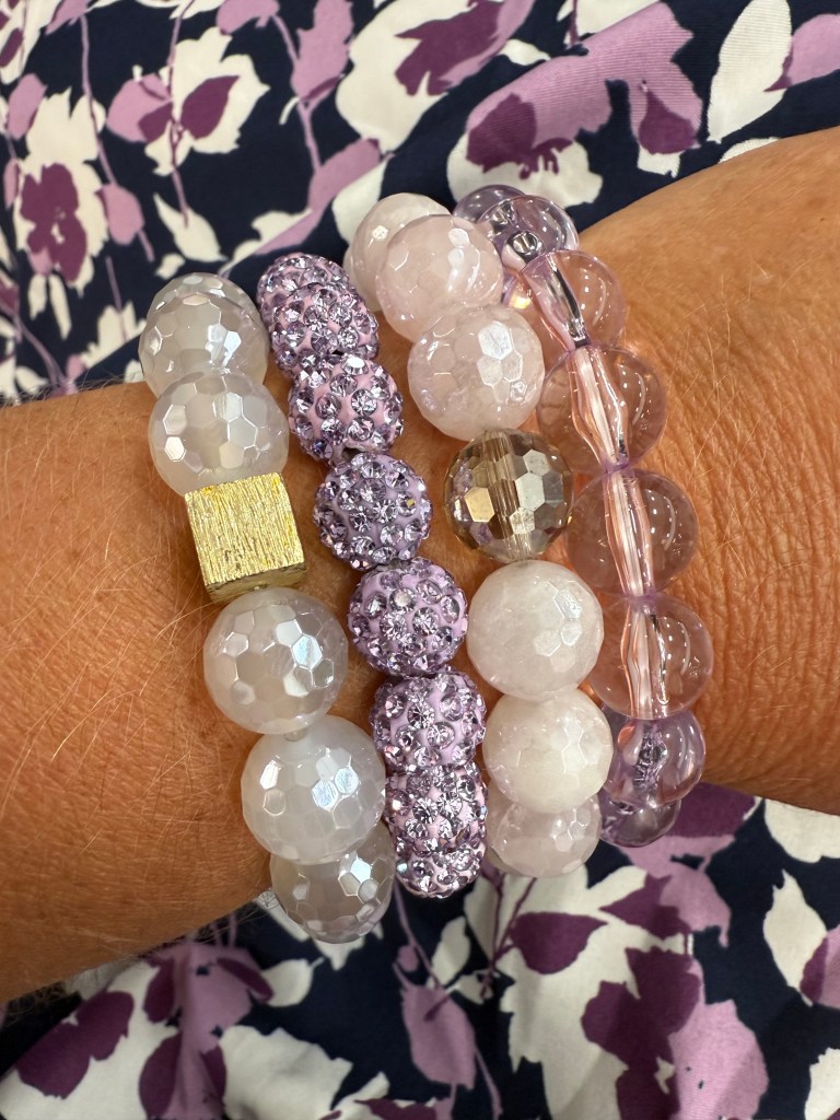 This bracelet assortment features three different brands. The pearlesque beadeds are from Bourbon and Boweties; the pave beaded is from Rustic Cuff; and the lilac tinted clear beaded is from Allie + Bess. This combo perfectly matched my floral dress from SHEIN.