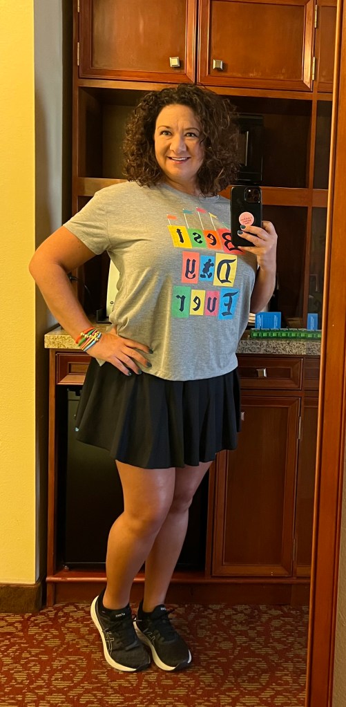 Show set-up days are always a day for cute, but comfy. It is a 12+ hour day, so comfort is key. Here, I am wearing my “Best Day Ever’ tee from Walt Disney World, a Halara tennis skirt, a pair of ASICS, and silicone Bali bracelets from Canvas Style. Even on set-up days, I like to try and accessorize, and silicone Bali bracelets are perfect, as they are stylish and flexible! #ootd #disneytees #always accessorize #casualwear