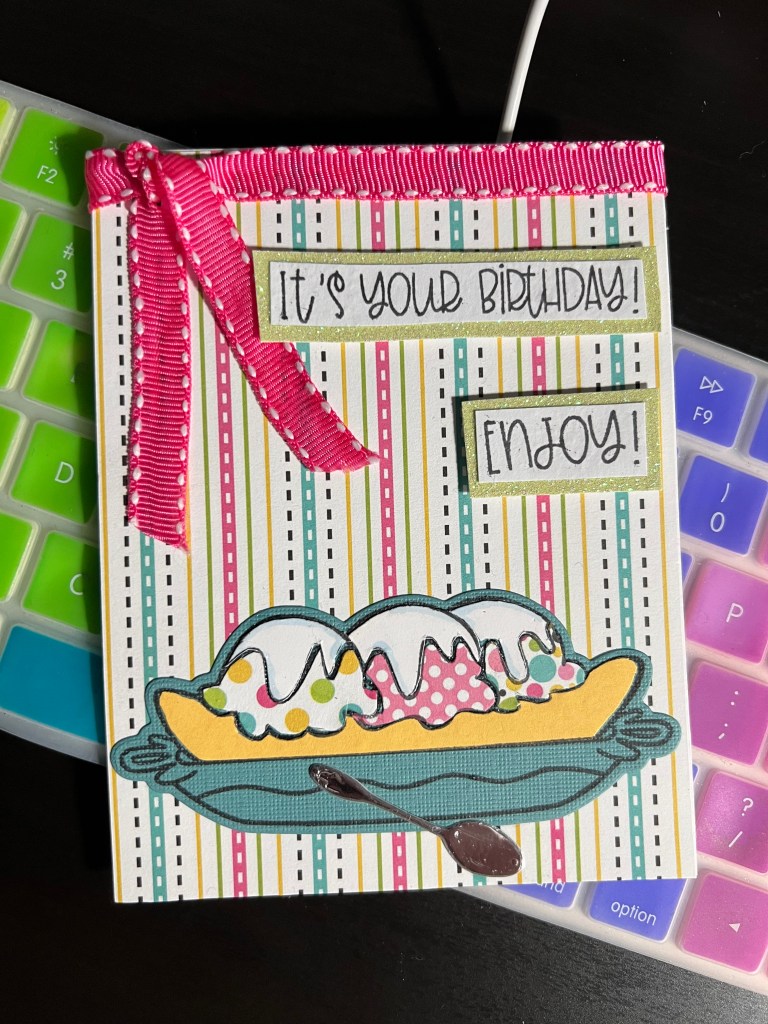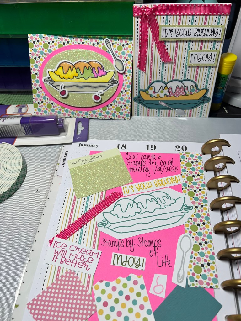 At one time, I had a subscription to one of the Stamps of Life clubs. At one point I had a subscription to the die hard club, which was a monthly subscription that included a brand new stamp and die set each month. At the same time, I believe that I also had a subscription to the card kit club, which was a monthly subscription that included all sorts of matching items (patterned paper, cardstock, embellishments, etc) to create several cards. One of those months provided me with the bananasplit2stamp’clear stamp set and the bananasplit2stamp die set, and I used those two products to create these birthday cards. Once I completed the cards, I used the leftover supplies to document in my junk journal. I think this is a fun way to look back and remember your creative time. It can also be a great reference, should you like to recreate the card or something similar. #cardmaking #rubberstamping #birthdaycard #papercraft