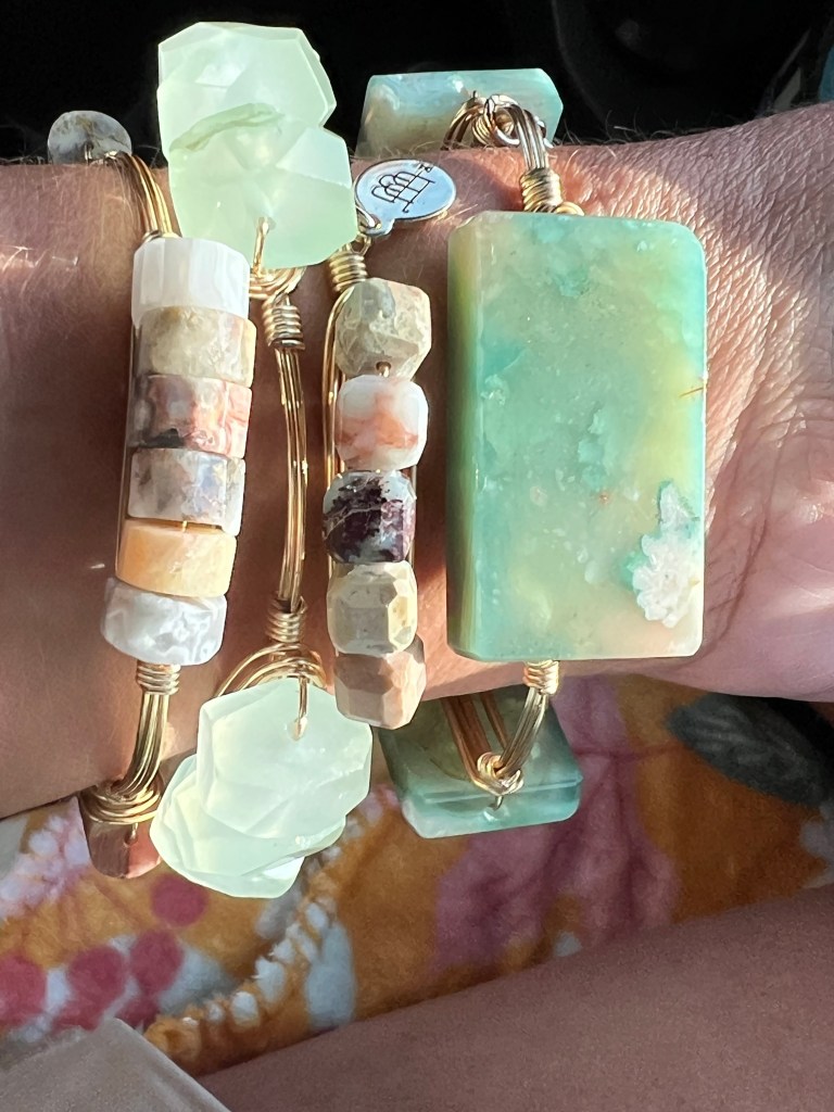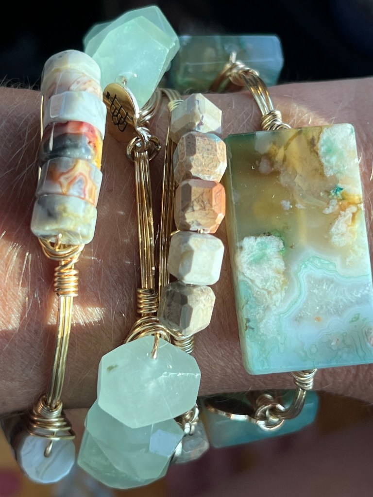 These earth toned bangles from Bourbon and Boweties are stunning. I love pairing the different sized pieces together; such as a larger stone bangle with a medium stone bangle, and even a smaller stone bangle. Creating color combinations is also always fun. The stones on the large and medium piece remind me of sea glass. #banglestack #bourbonandboweties