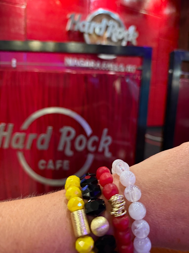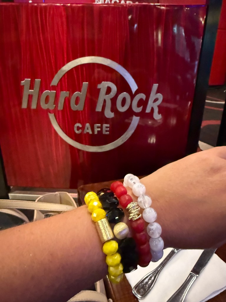 White beaded bracelet from Allie + Bess; red, black, and yellow beaded bracelets (Kendleys) from Bourbon and Boweties. This was a stack I wore when I did a quick visit to the American side of Niagara Falls, and had dinner at the Hard Rock Cafe there.